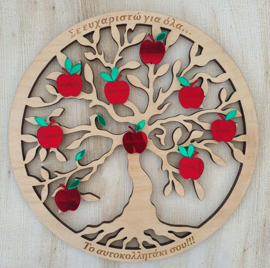 Ξύλινο διακοσμητικό δέντρο, κομμένο με ακρίβεια laser, με κόκκινα μήλα που αναγράφουν τις "Πνευματικές Ιδιότητες" (π.χ. αγάπη, χαρά, ειρήνη). Ιδανικό δώρο για δασκάλους, ή για διακόσμηση παιδικού δωματίου.