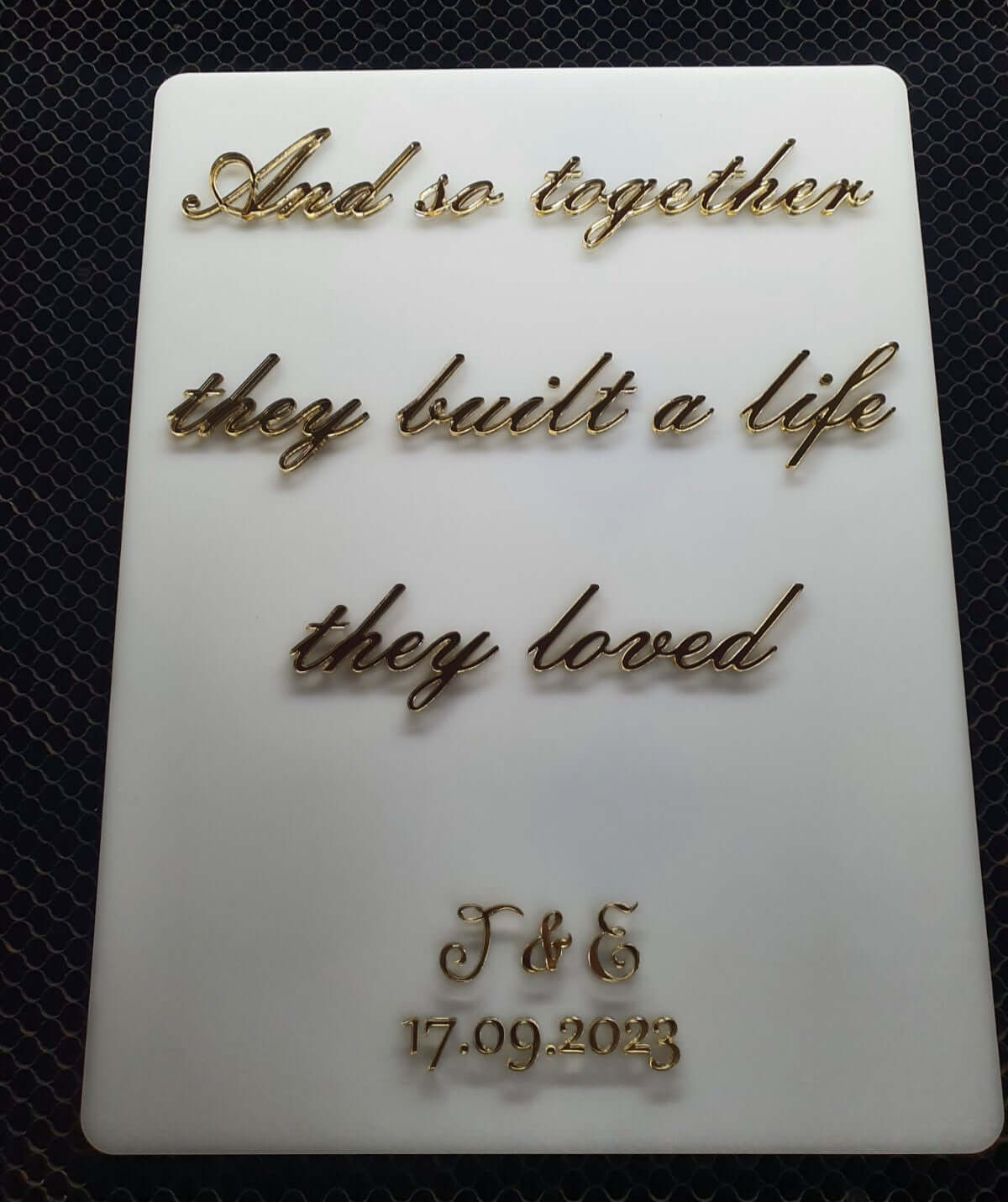 Εντυπωσιακή ακρυλική πινακίδα γάμου με φράση "And so together they built a life they loved", κομμένη και χαραγμένη με laser. Τα γράμματα είναι 3D, χρυσός καθρέφτης, που ξεχωρίζουν πάνω στο λευκό φόντο. Ιδανική για διακόσμηση γάμου ή ως αναμνηστικό δώρο.